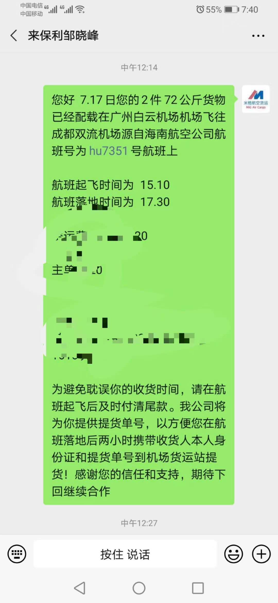 7.17日,广州客户2件72公斤货物紧急丛广州白云机场发往成都。客户上午送货到机场,下午航班到达成都,目前已经到达成都,客户机场自提,感谢您的支持信任,期待下回继续合作